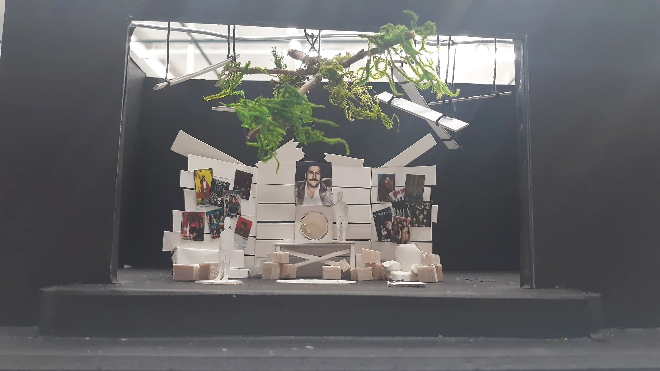 Scenic drafting and model creation for a theoretical production of Our Dear Dead Drug Lord by Alexis Scheer to take place in the Robert J Orchard Theatre in Boston, MA.