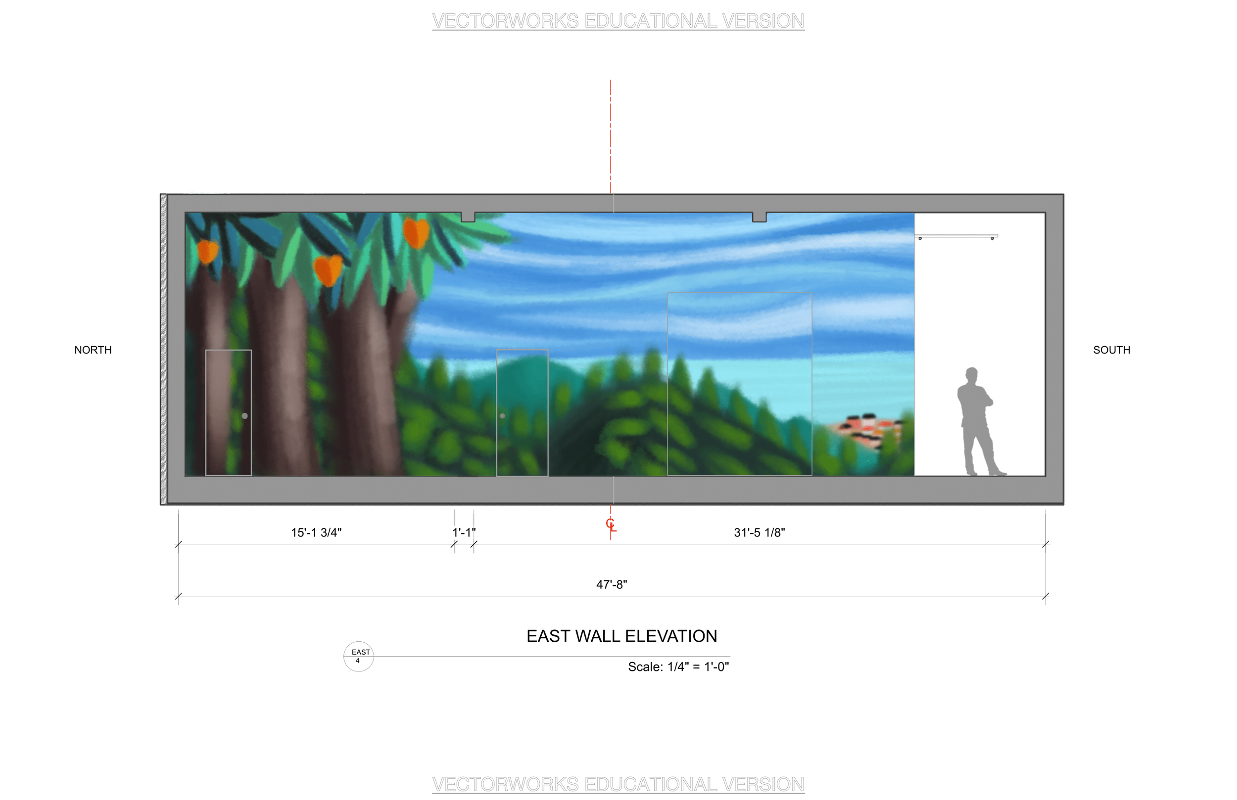 Scenic drafting and paint elevations for a theoretical production of Three Little Birds by Michael J Bobbitt to take place in Studio Theatre in Washington, DC.